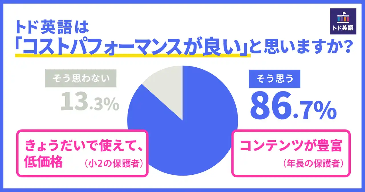 『「トド英語」は「コストパフォーマンスが良い」と思いますか?』という質問に対しても、全体の86.7%が「そう思う」と回答。月換算1,260円(6ヶ月プラン7,560円/子ども2人まで利用)という手頃な価格に加え、タブレット1台で自宅から手軽に学べる利便性が、多くの家庭から“費用対効果の高い学習手段”として評価され、「トド英語」の高い満足度につながっています。 |