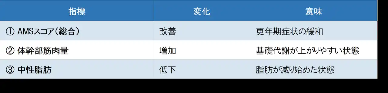 今回の調査では、AMSスコア・体幹筋肉量・中性脂肪という異なる3つの指標すべてに、統計学的に有意な改善が認められました。 |