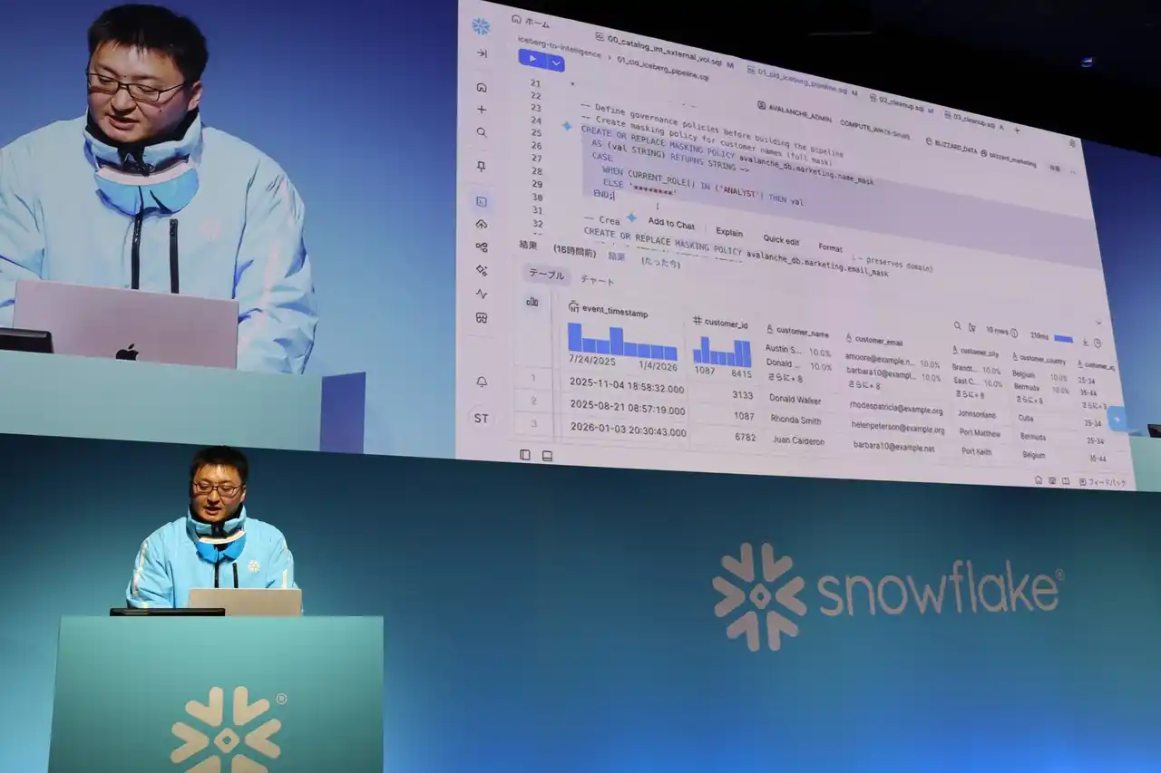 Christianの講演とあわせて、Snowflake合同会社 Developer Relations Lead Developer Advocateの田中 翔が実例を示すデモンストレーションを実施し、来場者の理解を深めました。Snowflake Intelligenceのデモでは、自然言語の指示だけで営業データの抽出やグラフ化を行い、市場拡大に向けた具体的な分析示唆を得るまでのプロセスを実演しました。続いて、AWS上の外部データとの即時連携や、自然言語からSQLコードを自動生成するCortex Codeの活用法を紹介しました。特に、AI関数を利用した個人情報の自動マスキング機能を実演し、強固なセキュリティとガバナンスを維持しながら、フルマネージド環境で容易にAIエージェントを構築できる実践的なプロセスを提示しました。 |