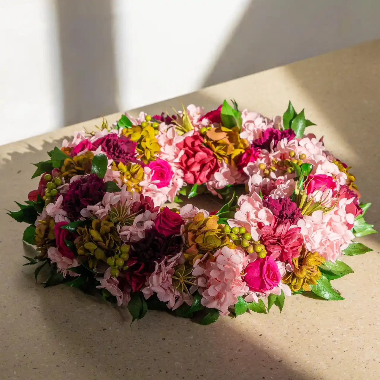 母の日をテーマに、プリザーブドフラワーでピンクトーンのをリースを作るレッスン。プリザーブドフラワーは、特殊加工により、生花本来の美しさや色合いを約2年ほど楽しめます。プリザーブドフラワーに欠かせないワイヤリングをはじめ、花材の重なりや強弱をつける挿し方や奥行きの付け方のテクニックを学びます。仕上がりサイズは直径約20cm前後で、壁に掛けても、置いて飾ってもバランスよく楽しめます。 |