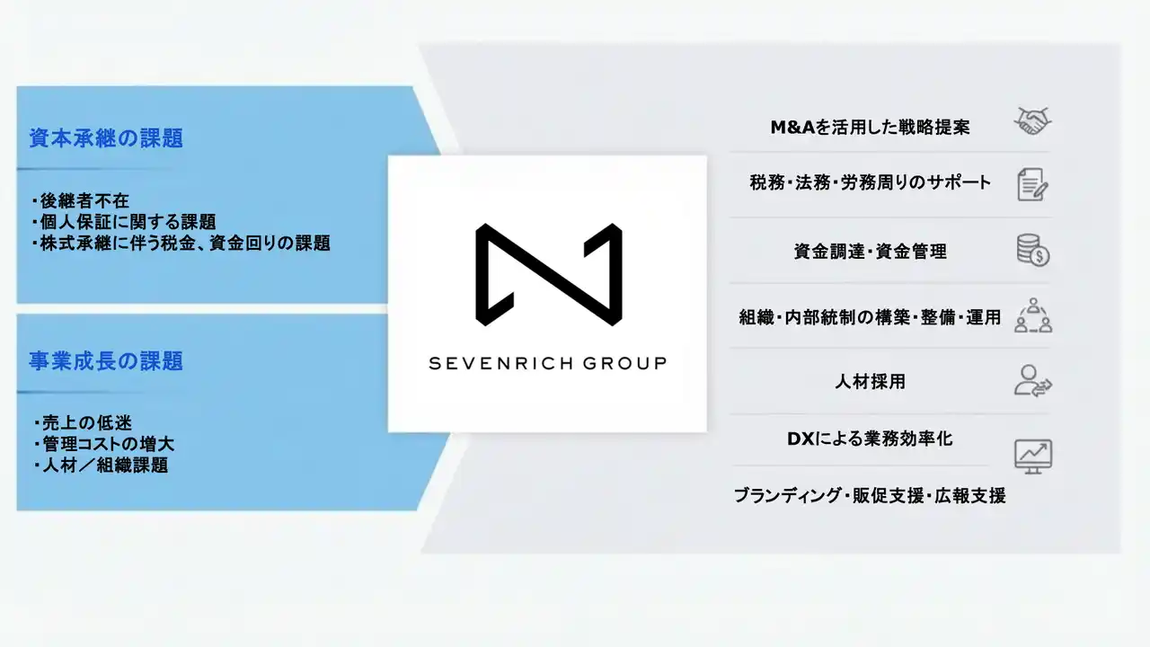株式会社SEVENRICH CAPITALは、事業承継やM&Aを通じて企業の成長支援を行う会社です。企業のグループ参画を通じて、経営支援や人材採用、事業戦略の推進など、ハンズオンでの支援を行っています。 |