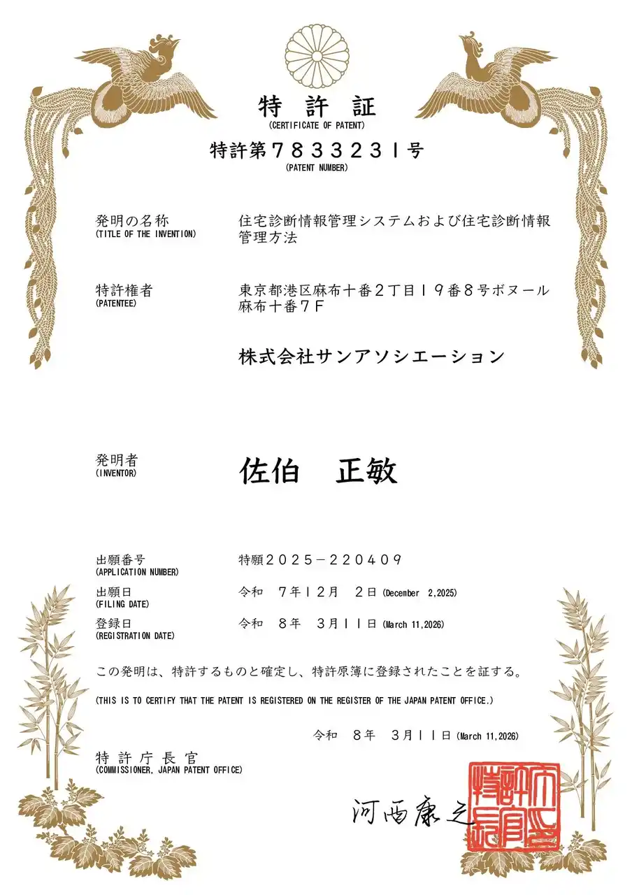 戸建て住宅の不動産売買および保全・メンテナンス事業を展開する株式会社サンアソシエーション(本社:東京都港区、代表取締役:佐伯正敏)は、スマートフォンを利用して点検・修繕履歴をデジタルデータとして蓄積・証明できる「住宅診断情報管理システム」において、ビジネスモデル特許を取得いたしました(特許第7833231号)。 |