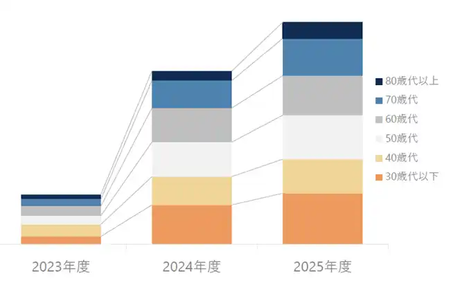 入浴中の死亡事故の約9割を65歳以上が占める中、同年代の登録者数が少ないことが本サービスの課題でした。そこで、高齢者への利用促進に注力した結果、70歳以上の登録者数が前年比で45%増加しました。特に、登録者数の少なかった80歳以上では前年比70%の増加という成果が得られました。 |