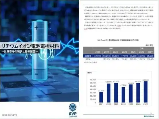 | 会員制マーケットリサーチサービスを提供している、株式会社SVPジャパン(本社:東京都中央区、代表取締役 社長:橋本雅、以下「SVPジャパン」)は、本日、SVP注目市場分析レポート「リチウムイオン電池電極材料-世界市場の現状と将来展望-」を、会員企業向けに公開いたしました。 | ||||||||||||