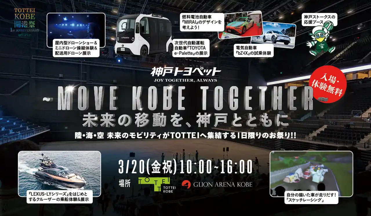 株式会社One Bright KOBE(住所:兵庫県神戸市、代表取締役社長 渋谷 順)は、2026年3月20日(金)から4月19日(日)の期間を『TOTTEI KOBE 開港祭 Supported by 神戸トヨペット』として、GLION ARENA KOBE やTOTTEI PARKなどで多彩なイベントを開催します。 |