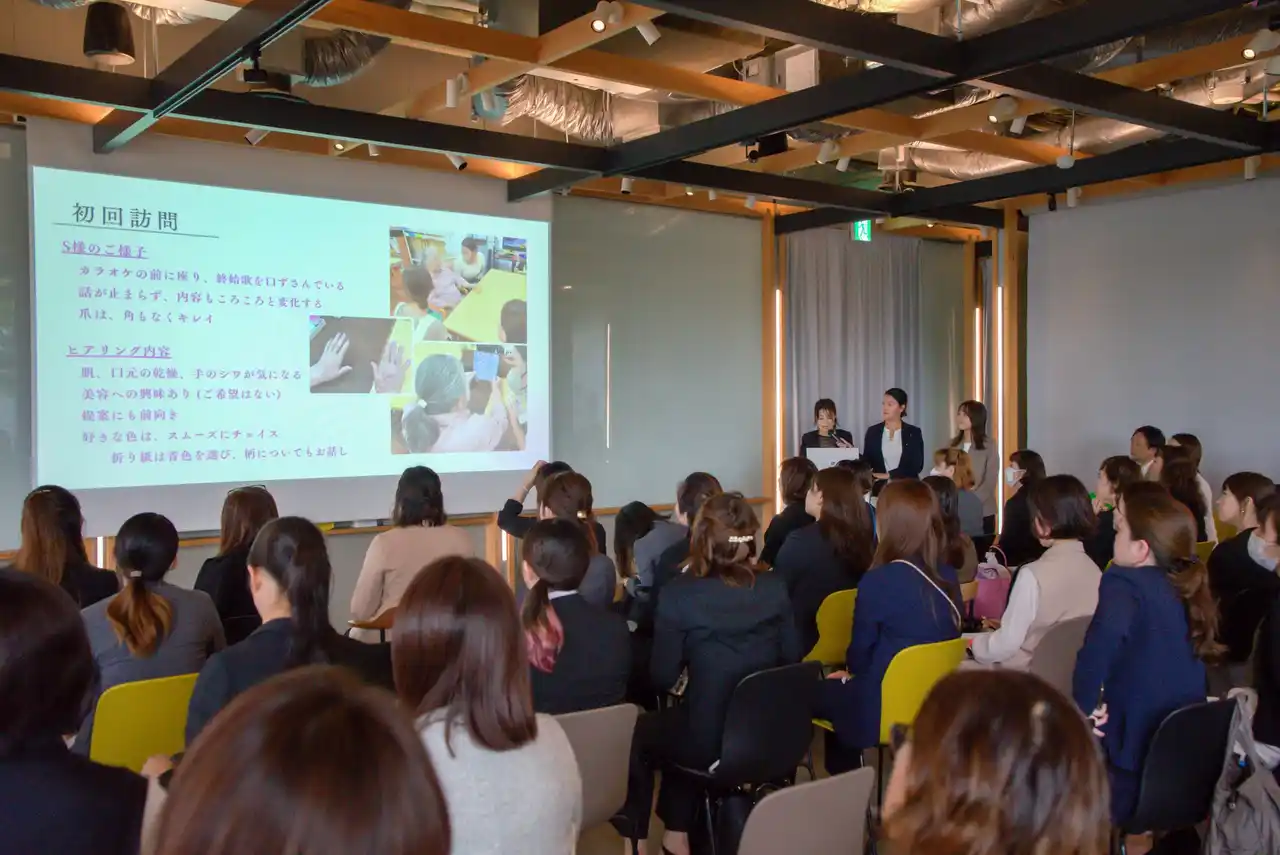 | 以前の発表会で報告された事例の一つに、要介護2の88歳女性へのアプローチがあります。 初回は「年寄りだから…」と消極的だった彼女に対し、ハンドトリートメントを継続。 2回目には「(前回を)思い出した」と安心した表情を見せ、最終的には「気持ちがいい。ツヤツヤになった」と自ら前向きな発言があり、追加でフェイシャルトリートメントを希望されるほどに、心身の変容が見られました。 | |||