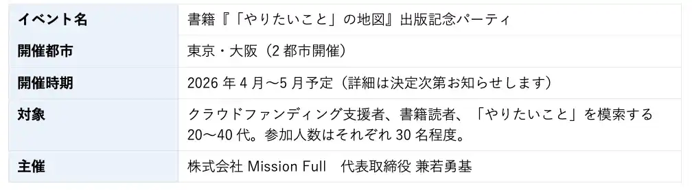 今回のパーティは、「書籍を読んで気づく」に留まらず、「人と出会い、動き出す」へと参加者を連れていく場です。東京・大阪という2大都市で同時期に開催することで、この変化の波を全国へ広げる起点にしたいと考えています。 |