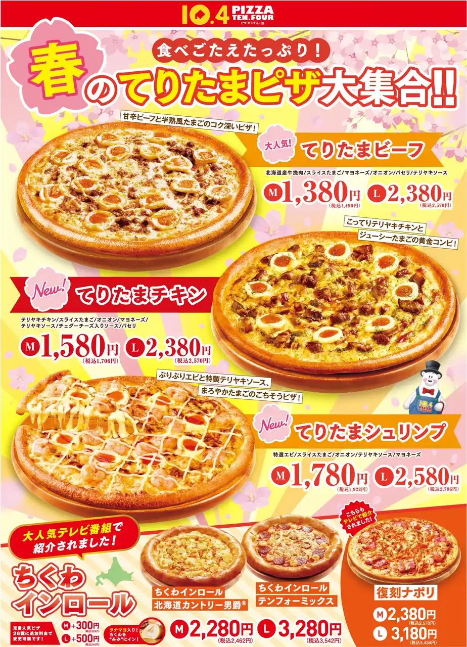 テンフォー春の新商品は、特製テリヤキソースとまろやかな半熟風たまごをあわせた、てりたまピザが大集合! |