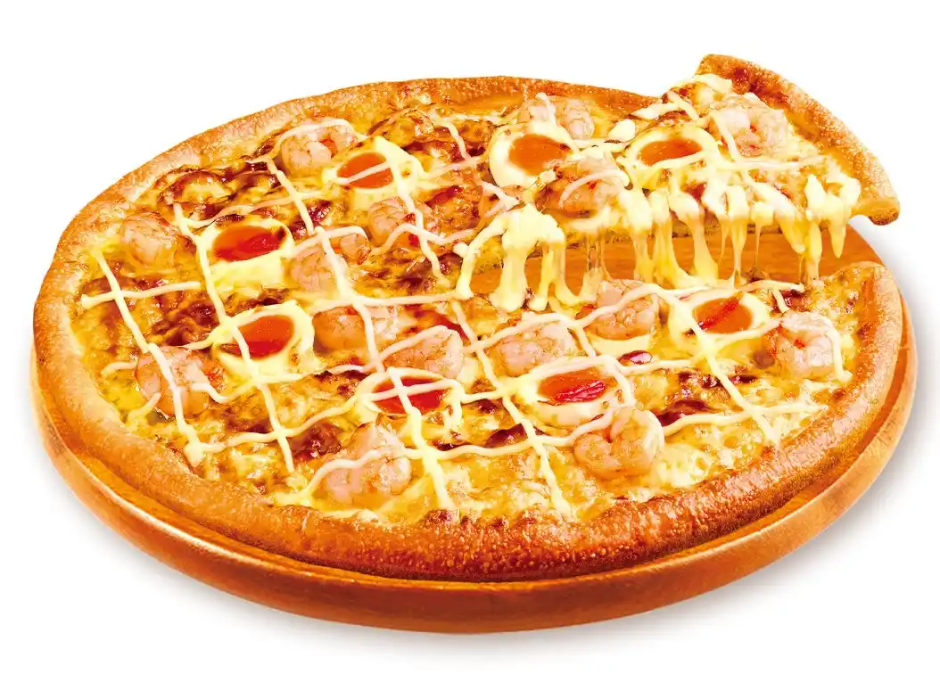 ぷりぷりエビと特製テリヤキソース、まろやかたまごのごちそうピザ! |