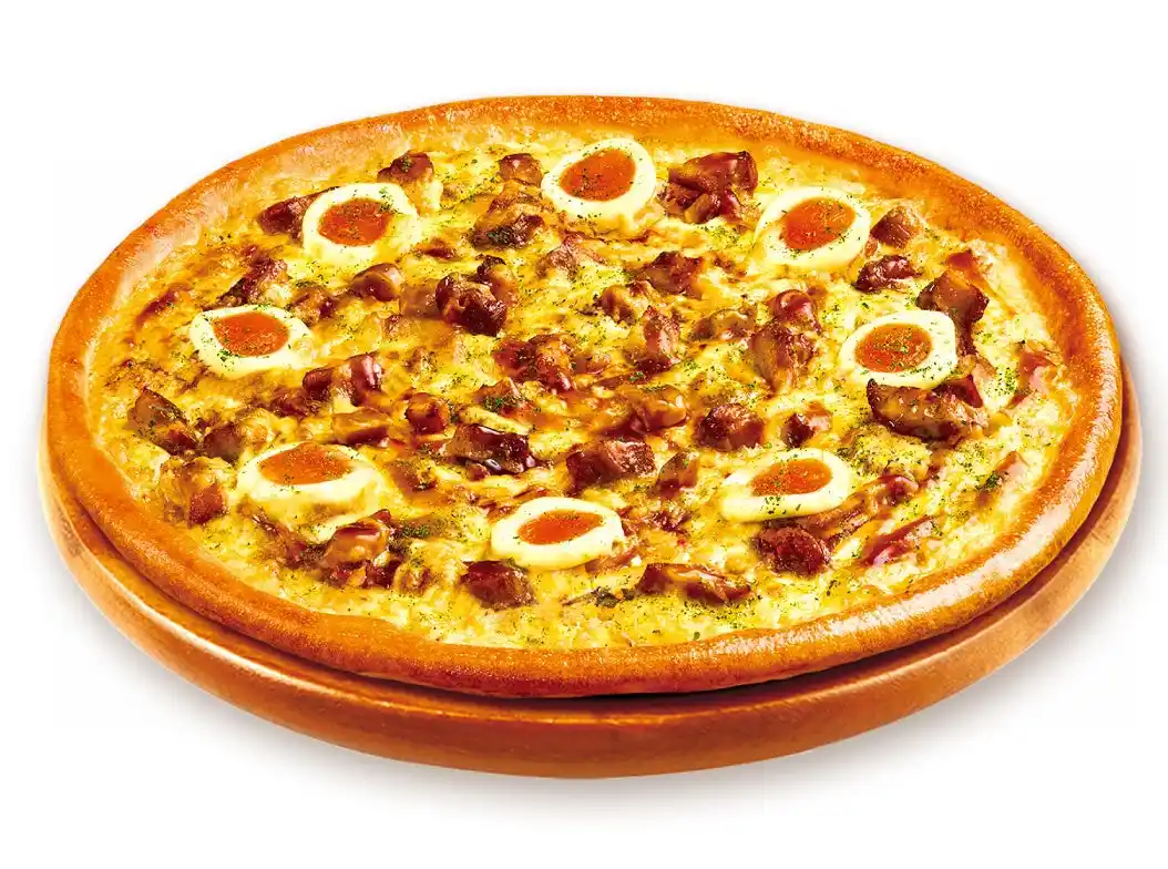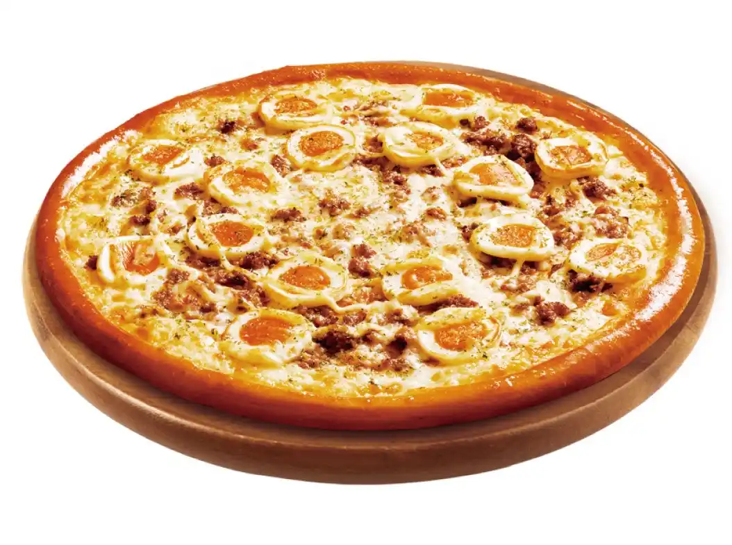 『てりたまシュリンプ』はぷりぷりのエビと半熟風たまごを贅沢にのせたクリーミーなピザ。シャキシャキのオニオンとコク深いマヨネーズが、素材の旨みをさらに引き立てます。 |