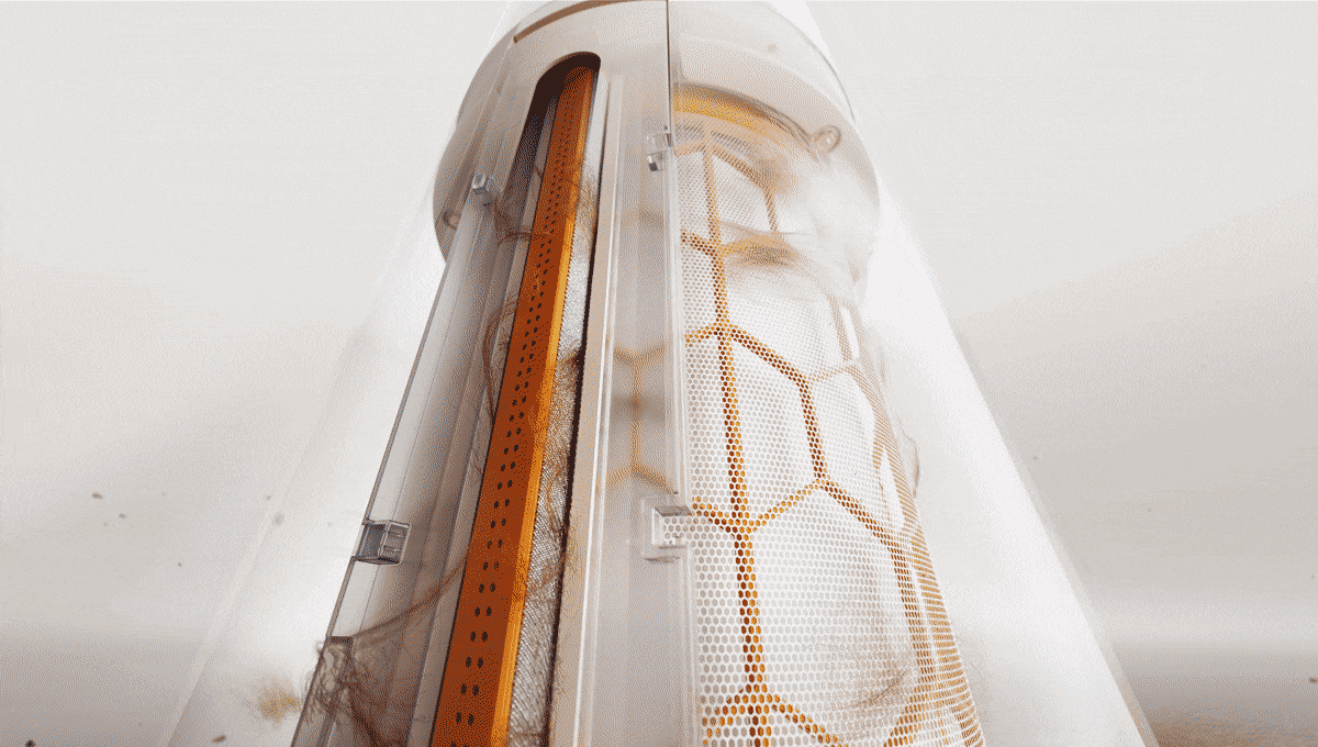 本製品は360°フィルターでペットの毛やホコリを捕集し、世界初(※)のローラーブラシ自動クリーニング構造でフィルターを定期的に自動清掃します。 |
