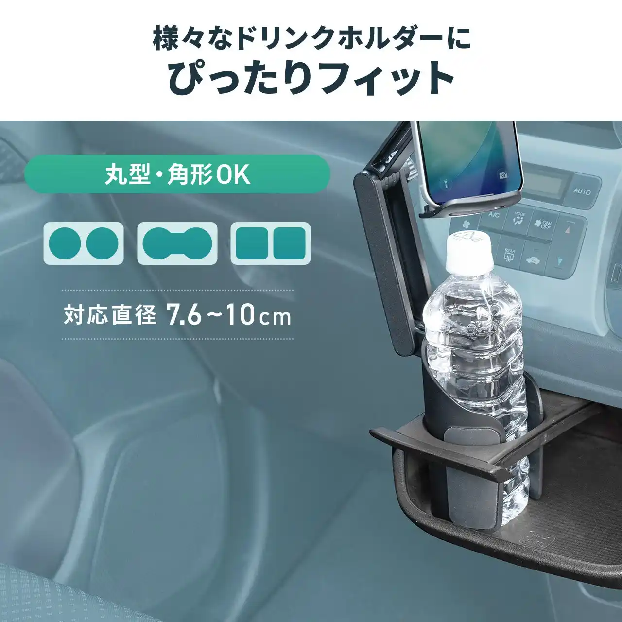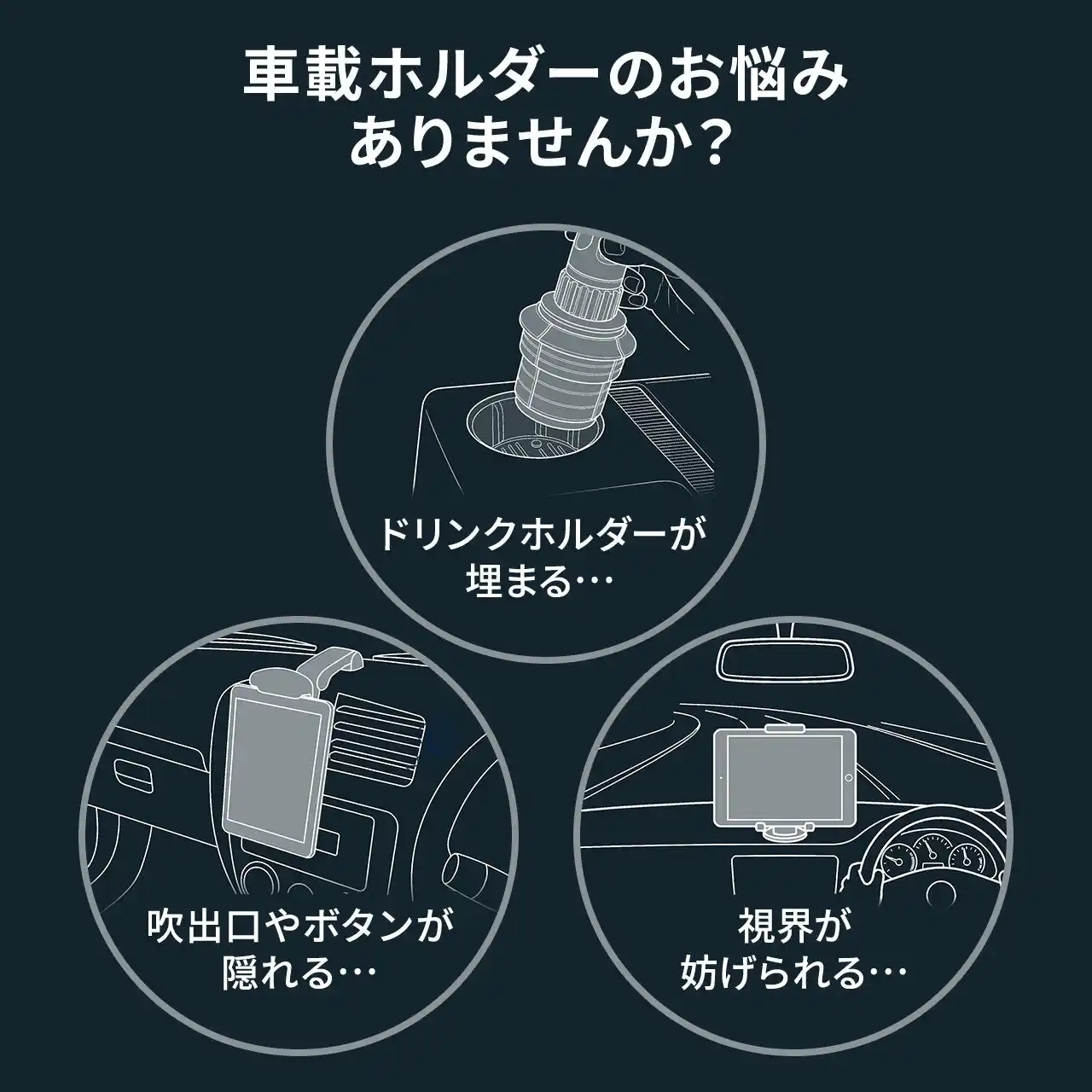 | 車載ホルダーを使うと、吹き出し口やボタンを隠してしまう、視界の妨げになる。邪魔にならないドリンクホルダー取付タイプだと、飲み物が置けない。そんな悩みに応えるのが本製品です。ドリンクホルダーに設置しながら、ドリンクホルダーをつぶさず飲み物も置ける設計で、タブレットやスマートフォンを邪魔になりにくい位置へ設置可能。車内の使いやすさを損なわず、快適なドライブ空間を実現します。 | |||||||||