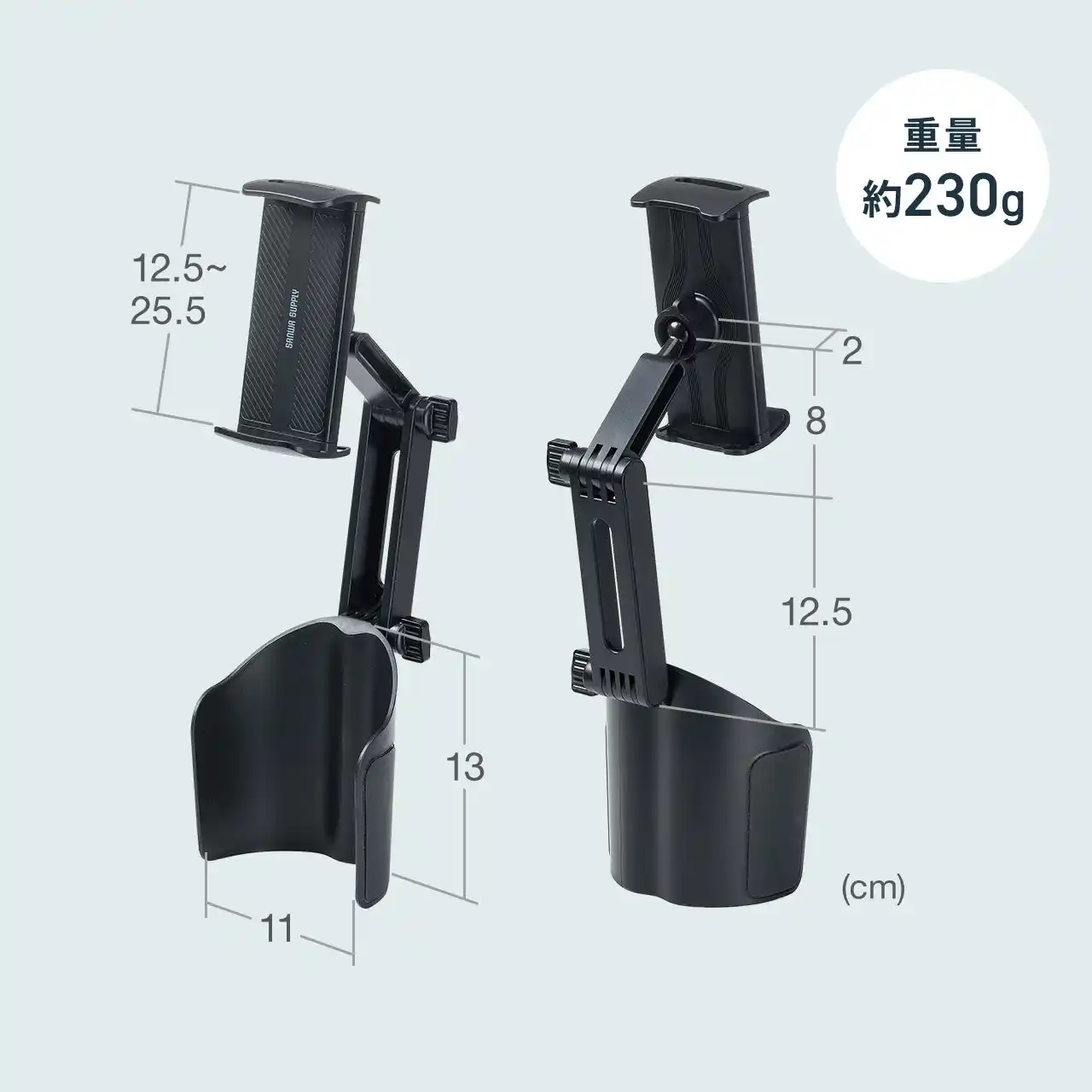 | 本製品は前席だけでなく、後部座席のドリンクホルダーにも設置しやすく、車内のさまざまな場所で活躍します。たとえば助手席では地図や情報確認用に、後部座席では動画視聴用にと、用途に応じた使い分けが可能です。車での長時間移動のン時間も快適な時間にする頃ができます。 | |||||||||