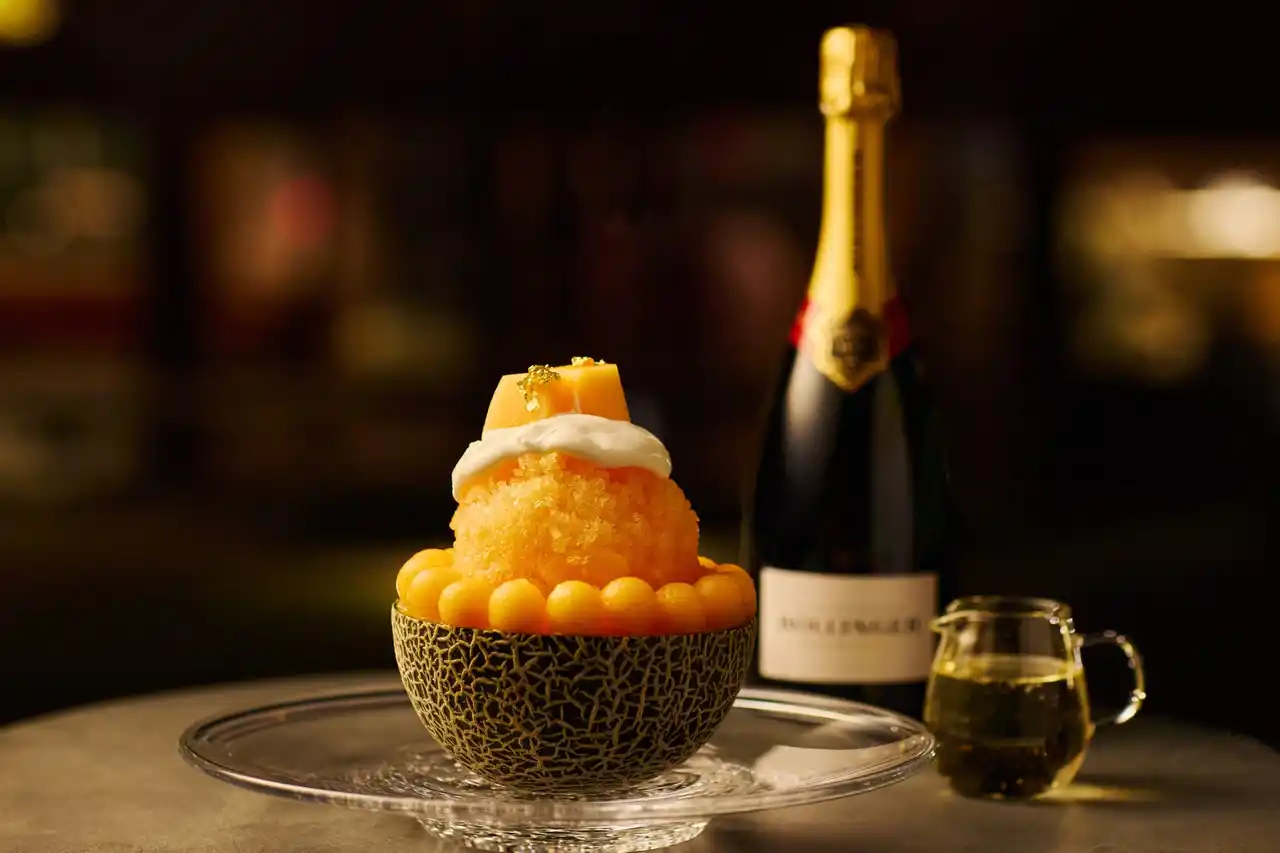 | 赤肉メロンを丸ごと1玉贅沢に使用し、ファーム星野の乳製品と組み合わせたかき氷です。器にはメロン半分を使い、その上に凍らせた果肉を削ったメロン氷を盛り付けます。氷の中にファーム星野のミルクソフトを入れ、上からリコッタとホエイのエスプーマをかけて仕上げます。メロン本来の甘みに乳製品のコクと爽やかな酸味が調和した、ここでしか味わえない一品です。さらに、シャンパンを注ぐと風味が一層引き立ち、大人のフロートとしても楽しめます。 | |||