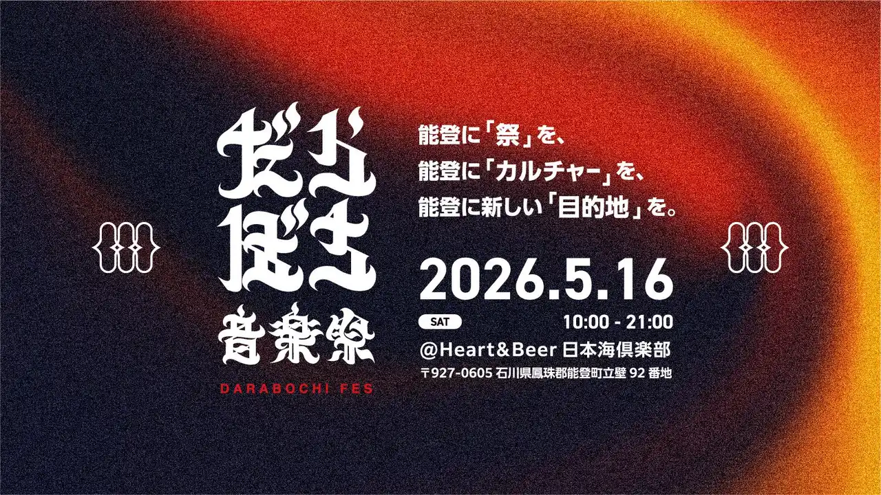 音楽の力で能登半島に新たな“引力”を生み出す音楽祭「だらぼち音楽祭」が、2026年5月16日(土)、石川県鳳珠郡能登町・Heart & Beer 日本海倶楽部にて開催されます。 |