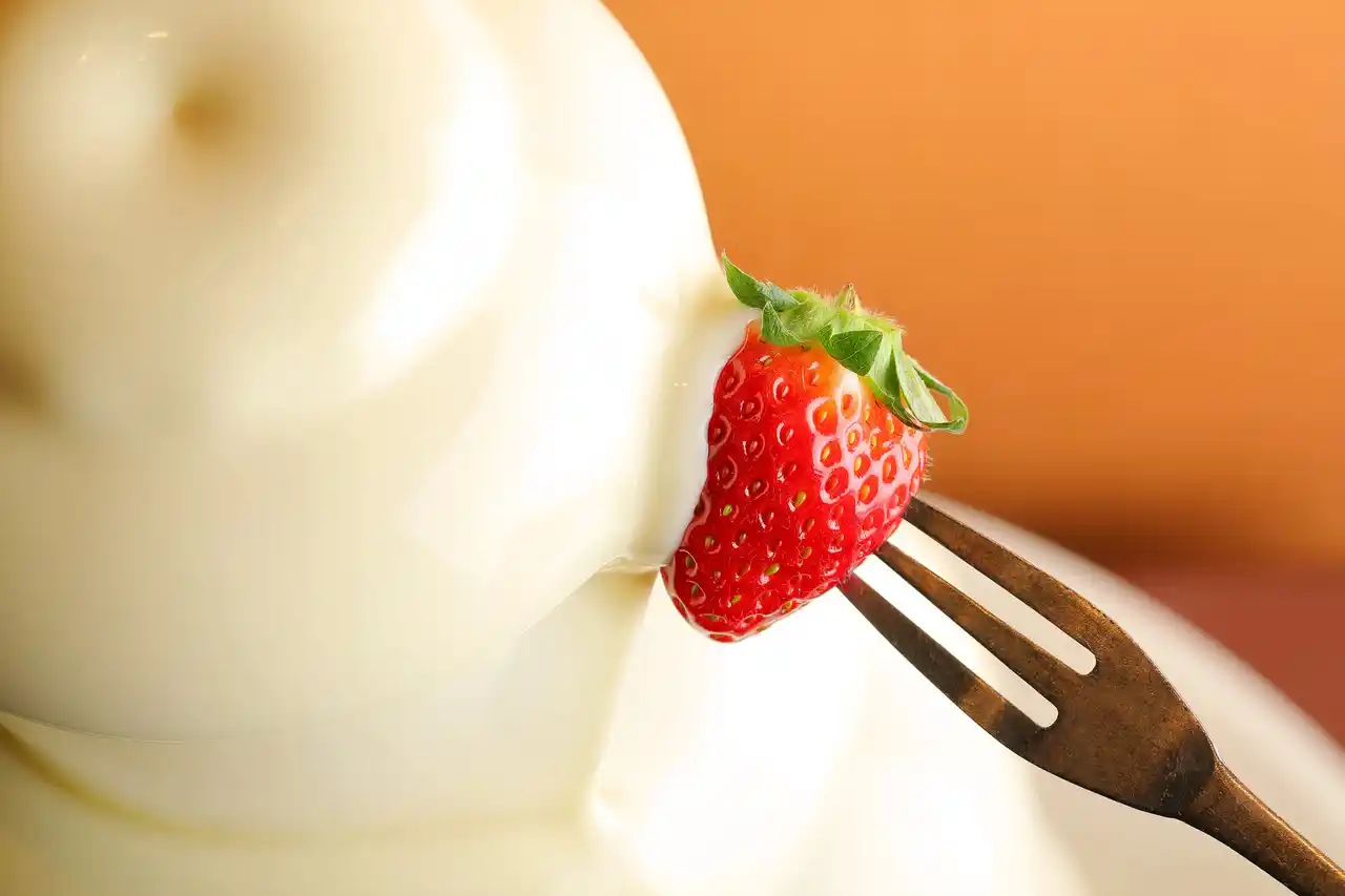 いちごとの相性が抜群なのが、真っ白に輝くホワイトチョコレートファウンテン。いちごをくぐらせれば、思わず写真に撮りたくなる可愛らしいビジュアルに。 |