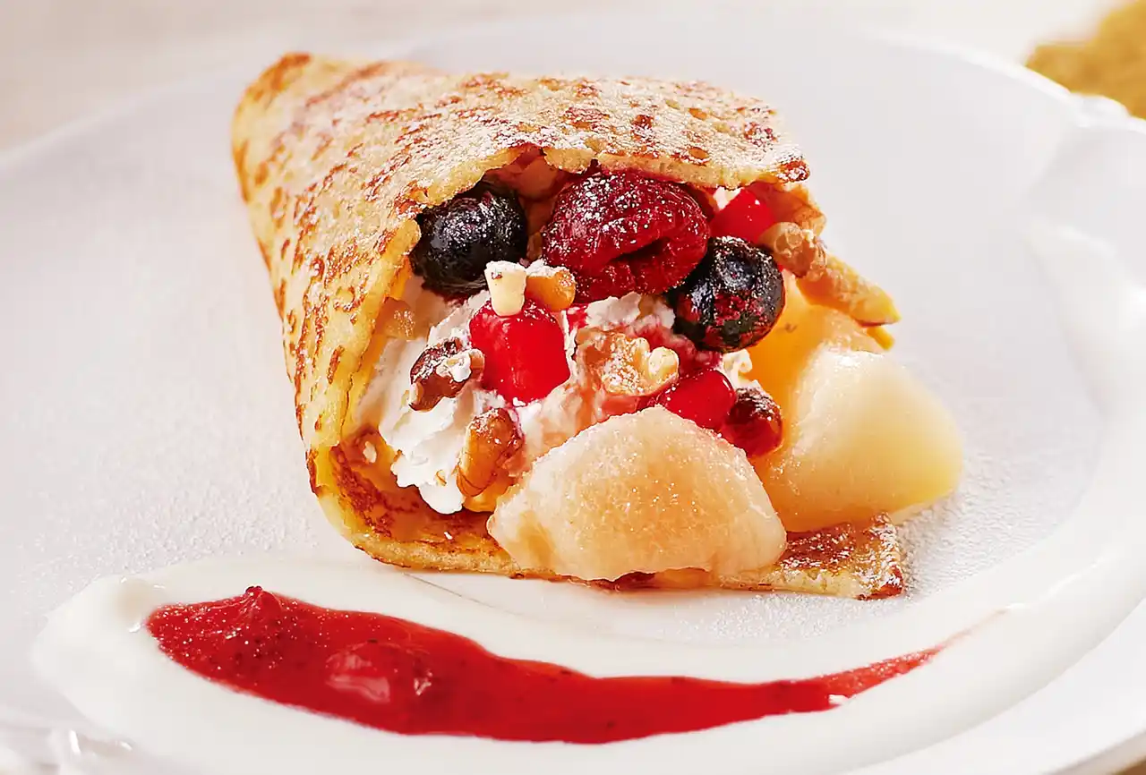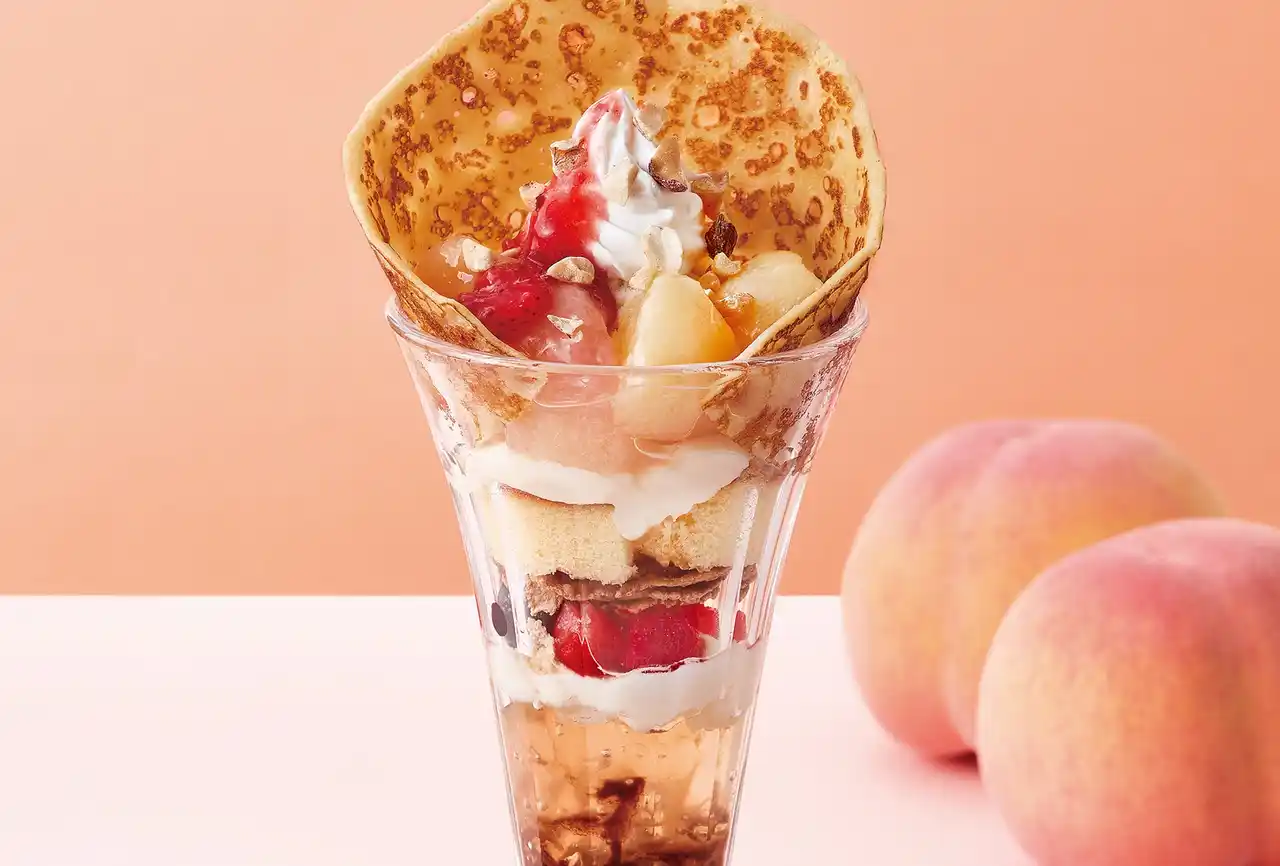 もちもち食感のクレープ生地で、みずみずしい白桃の果肉と3種のベリーを包み込みました。華やかな香りにあふれたリッチな味わいをお楽しみいただけます。 |