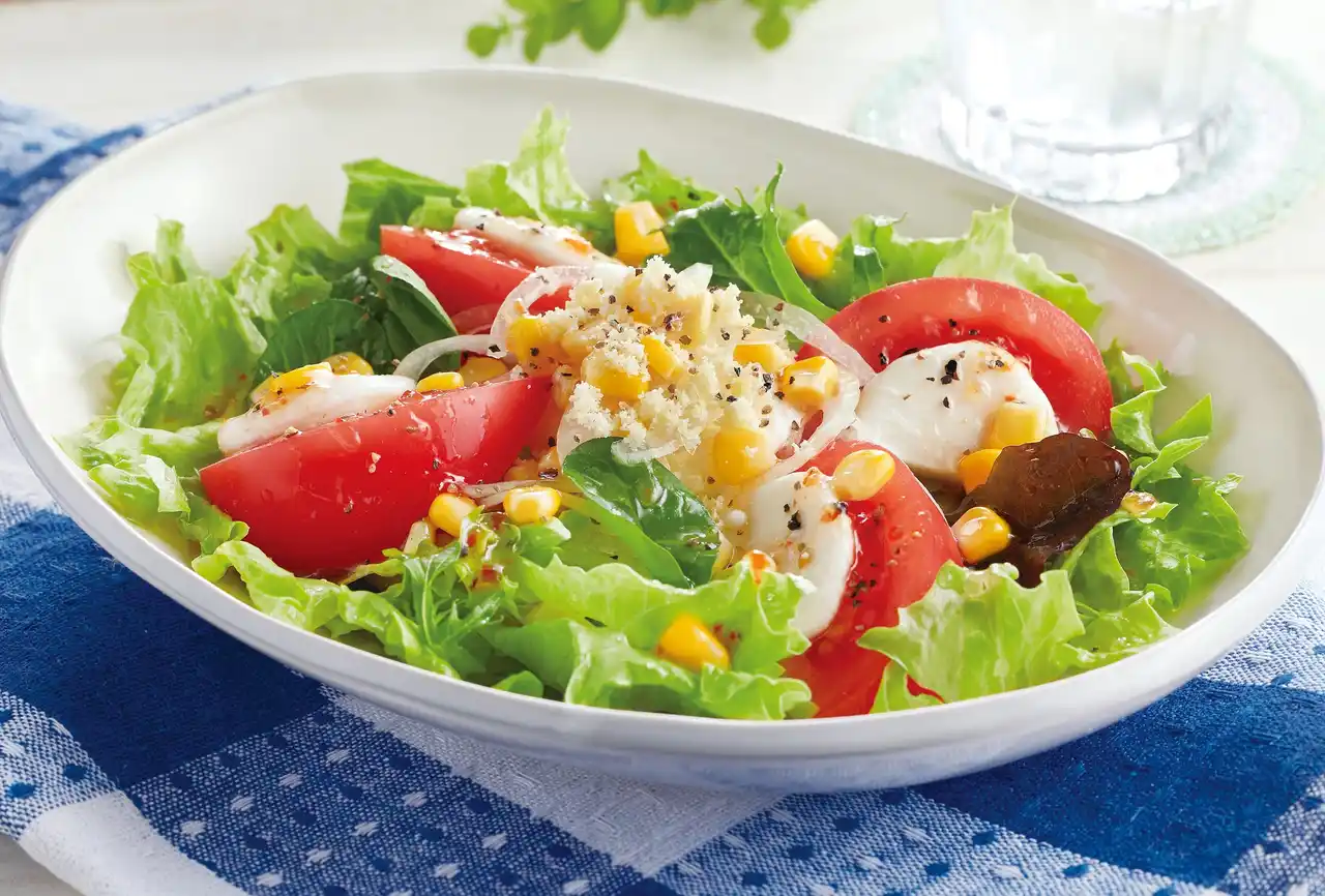 シンプルながらも、素材の旨味、ドレッシングの酸味と香りが織りなす、ごちそうサラダ。赤・白・緑のコントラストが美しく、お食事を華やかに彩ります。 |