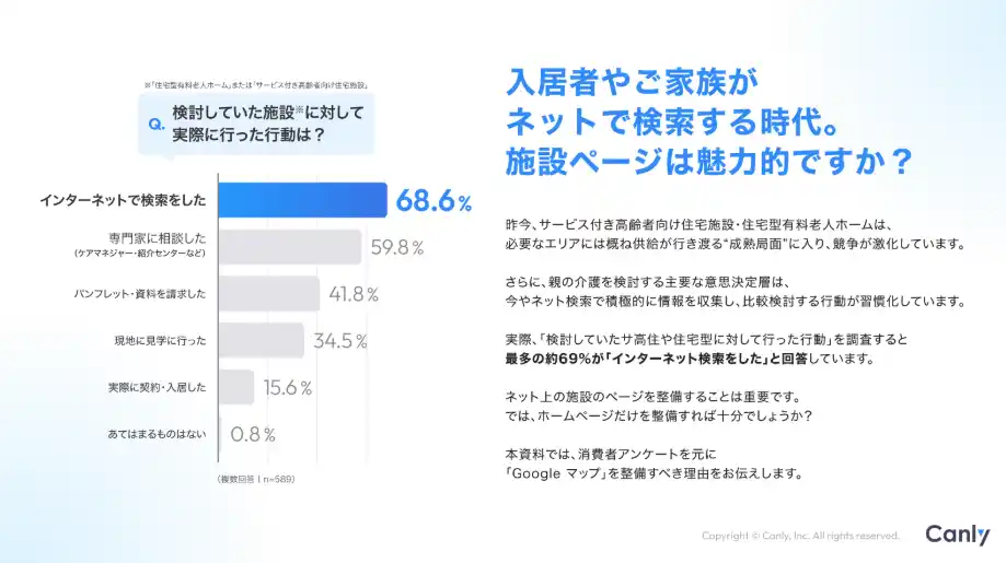 | 本レポートでは、こうした「施設選びのリアルな行動データ」をもとに、入居検討者やご家族に見つけてもらう上で、なぜGoogle マップを整備すべきか解説しています。 | |||||||||||