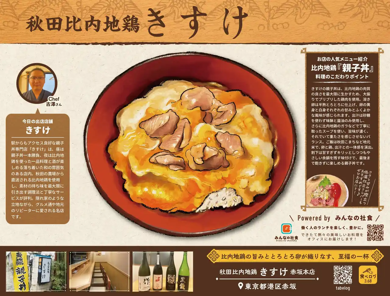 有名店社食サービスを展開する株式会社みんなの社食(本社:東京都港区、代表取締役CEO:齋藤武仁)は、当社サービスに加盟し、社食として料理を提供している、東京・赤坂の親子丼「秋田比内地鶏 きすけ 赤坂本店」のインタビュー記事を公開いたしました。 |