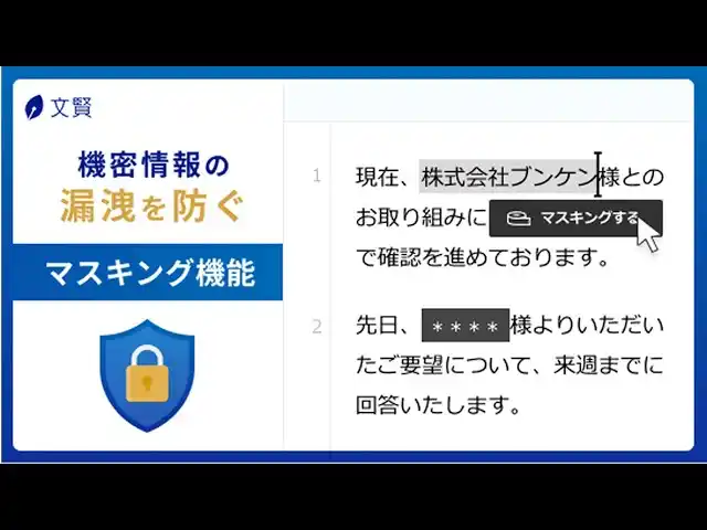 文賢のマスキング機能を使えば、機密情報をすばやく隠すことができ、以下のようなシーンで役立ちます。 |