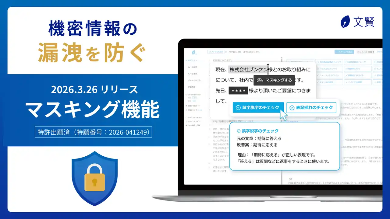株式会社ウェブライダー(本社:京都市中京区、代表取締役:松尾茂起)が提供するAI校正ツール「文賢」は、「AIアシスト」機能において、個人情報や機密情報を伏せ字にできる「マスキング機能(※)」をリリースしました。 |