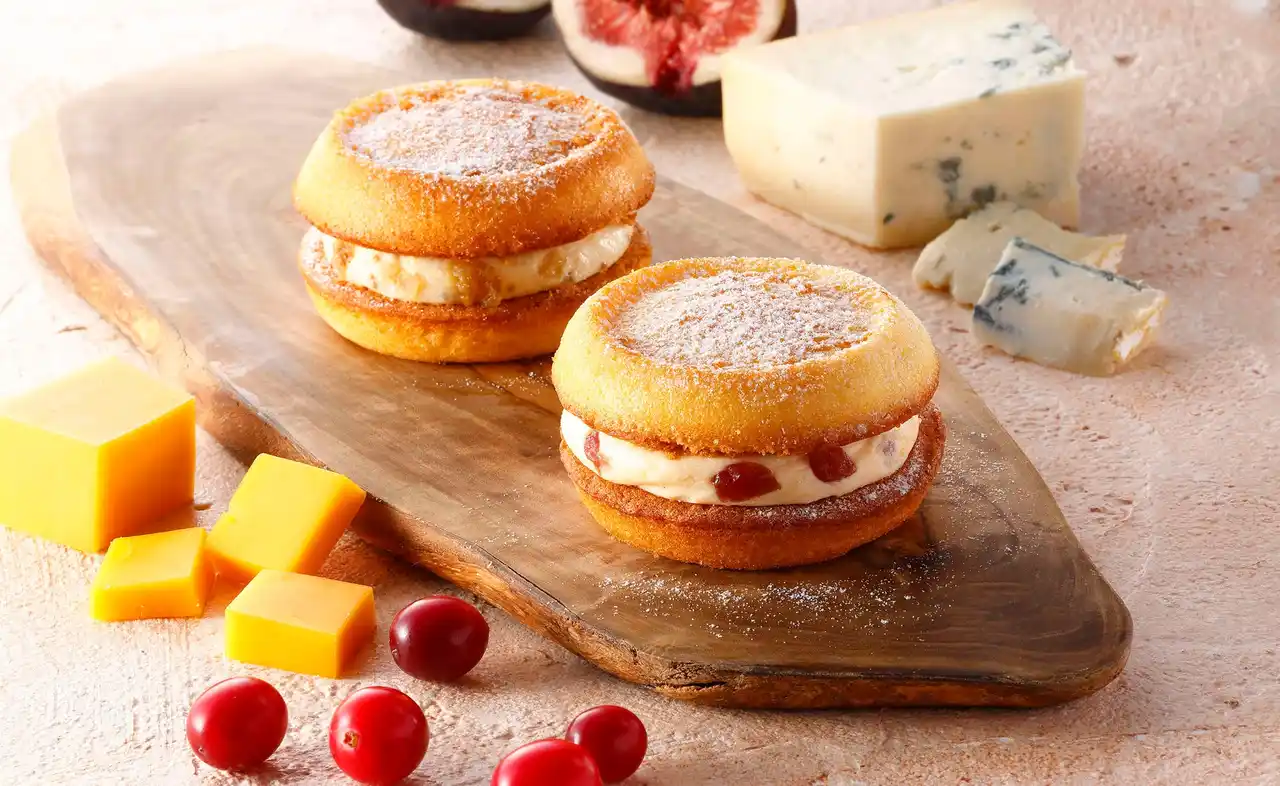 季節限定の新商品である『フィナンシェ チェダーチーズ&トロピカルフルーツ』。 |