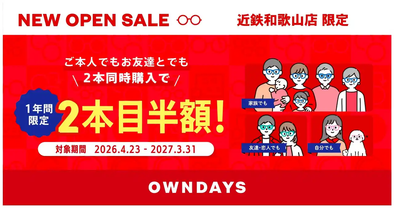 | OWNDAYSでは、「NEW OPEN SALE」終了後の2026年4月23日(木)から2027年3月31日(水)まで、毎回ご好評をいただいているオープンキャンペーン「2本目誰とでも半額割」を開催いたします(※2)。 | |||||||||||