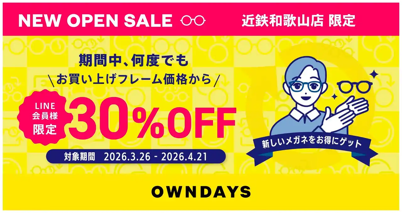| 2026年3月26日(木)から2026年4月21日(水)までの期間、近鉄和歌山店をご利用いただくお客様を対象に、6,000円(税込)以上フレームが表示価格から30%OFFとなる「NEW OPEN SALE」を実施いたします(※1)。本キャンペーンは、OWNDAYS公式LINEアカウントへのご登録を条件に、期間中、何度でもご利用いただけるお得な内容となっています。この機会にぜひご利用下さい。 | |||||||||||