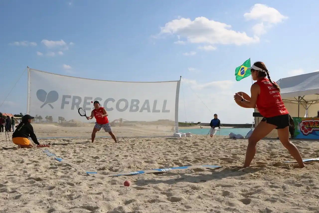 フレスコボールとは? フレスコボールは、ブラジルのリオデジャネイロ発祥のビーチスポーツです。1945年にリオ・デ・ジャネイロのコパカバーナビーチで考案され、現在は世界各地のビーチで親しまれるようになっています。フレスコボールの最大の特徴は、向かい合う2人が競い合うのではなく、協力してラリーを続ける採点競技という点。競技時間は5分間、7mの距離を保って試合を行います。協力してラリーを続ける様子から「思いやりのスポーツ」とも言われています。