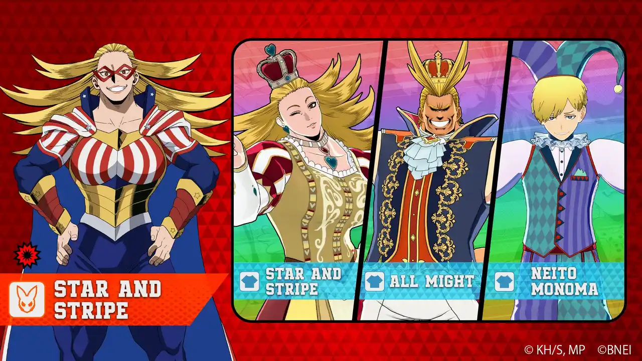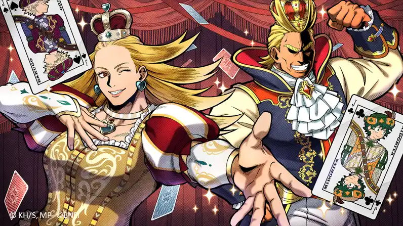 新プレイアブルキャラクター「スターアンドストライプ」に加え、2.5周年記念のトランプモチーフ新コスチューム【スターアンドストライプ(トランプ・クイーン)】や【オールマイト(トランプ・ダイヤ)】が登場!その他、復刻コスチュームの【物間寧人(道化師)】が手に入るチャンス! |