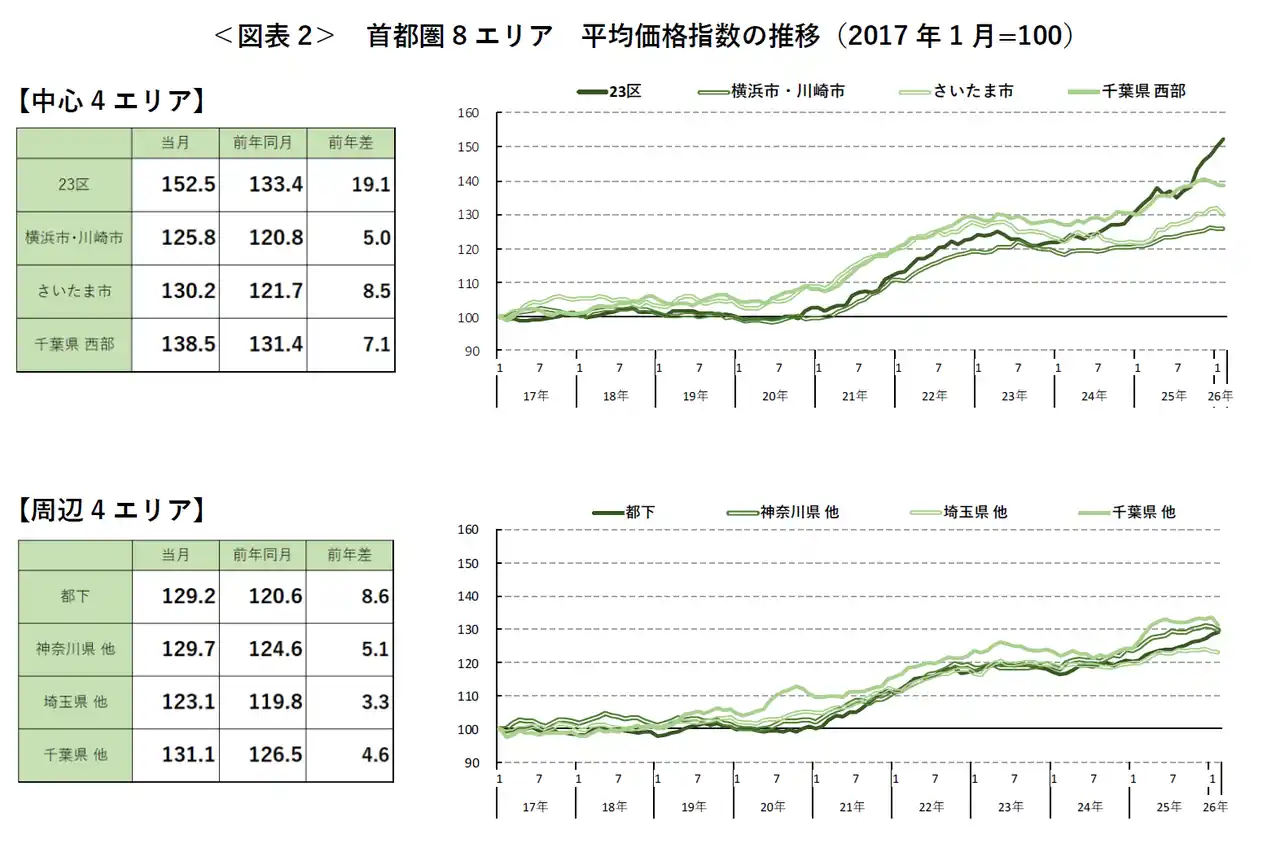 エリア別の前月比では、東京都(23区/都下)のみ上昇。それ以外では千葉県西部が3カ月連続で下落するなど4エリアが連続下落となっており、2026年に入ってから価格上昇の勢いにやや鈍化が見られる。一方、前年同月比では、11カ月連続で全エリアが前年同月を上回った。 |