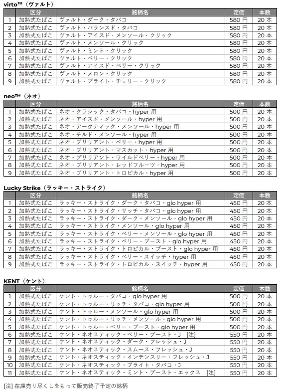 | ブリティッシュ・アメリカン・タバコ・ジャパン合同会社(本社:東京都港区、代表:マウリシオ・ララ、以下「BATジャパン」)は、加熱式たばこ「glo(TM)(グロー)」の専用スティック「virto(TM)(ヴァルト)」、「neo(TM)(ネオ)」、「Lucky Strike(ラッキー・ストライク)」、「KENT(ケント)」の全38銘柄について、2026年4月1日付の現行小売定価を据え置くことを決定しました。 | |||||||
