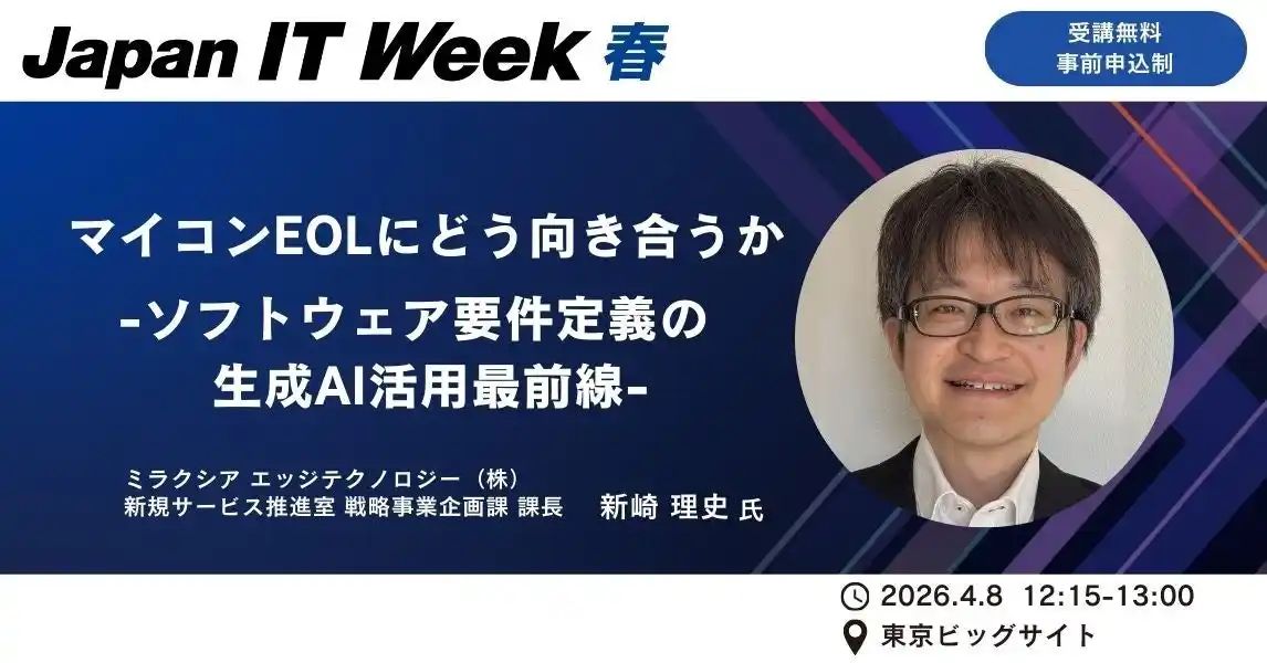ミラクシア エッジテクノロジー株式会社(本社:京都府長岡京市、代表取締役社長:中澤省吾)は、2026年4月8日(水)~10日(金)に東京ビッグサイトで開催される「Japan IT Week春カンファレンス」に登壇し、マイコンEOL(End of Life)対応における生成AI活用の最新動向を紹介します。 |