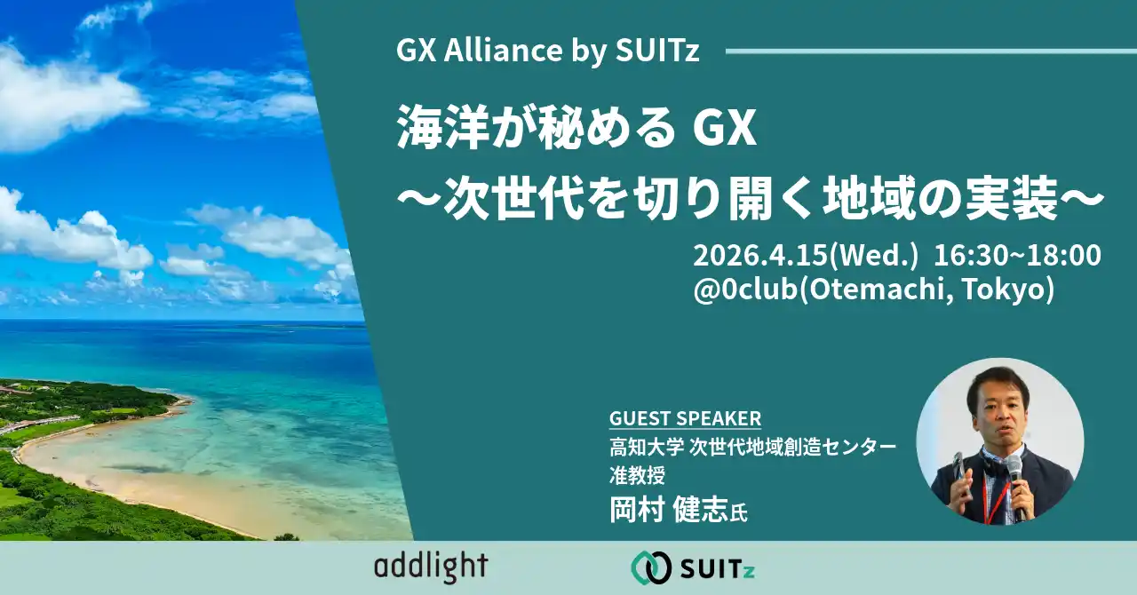 | 脱炭素・ネットゼロのための共創プラットフォーム「SUITz(スーツ)」を運営する株式会社アドライト(本社:東京都千代田区、代表取締役:木村 忠昭 以下、アドライト)は、官・学・民・スタートアップとの連携を通じてGX実証・事業化の起点をつくる共創の場「GX Alliance by SUITz」を毎月開催しています。 | |||||||||