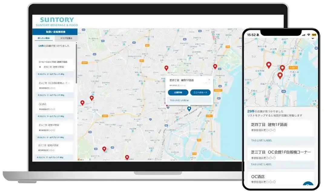 Biz「買えるお店マップ」の導入に至りました。これにより、サントリー食品インターナショナルが設置する「TAG LIVE! LABEL」のオリジナルラベル缶取扱い自販機の設置場所や取扱い情報を、お客様が手軽に検索できるようになりました。 |