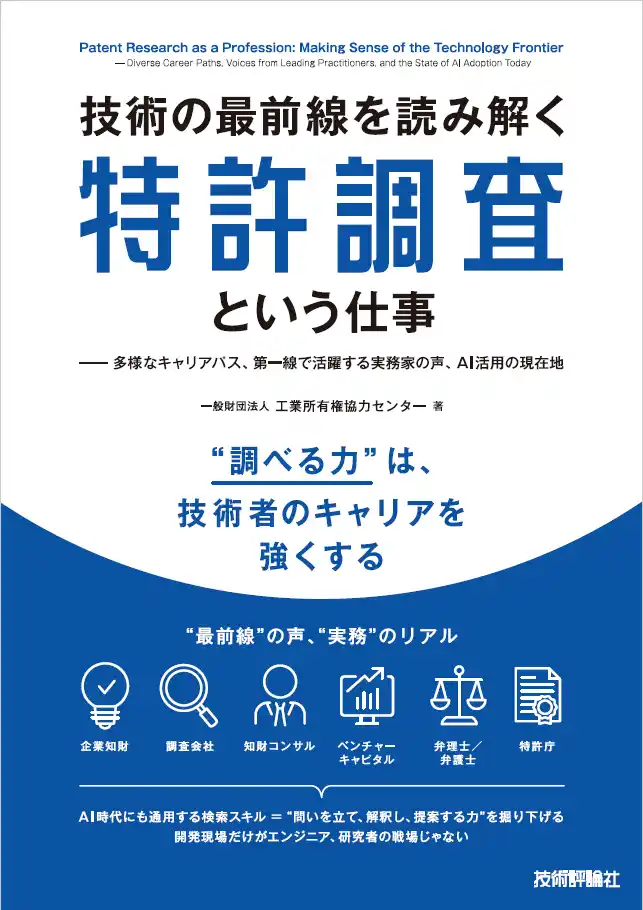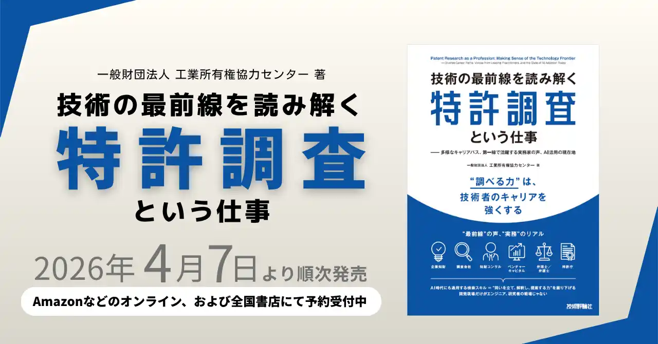 | 一般財団法人 工業所有権協力センター(略称:IPCC、本部:東京都江東区)は、特許調査の基礎からキャリアの広がり、実務のリアル、そして急速に進むAI活用までを一冊にまとめた書籍『技術の最前線を読み解く特許調査という仕事』を、2026年4月7日(※)より発売します。技術を“読み解き、整理し、使える形にする”――調査の現場で磨かれる論理思考とリサーチスキルが、研究開発や事業戦略を支えています。理系・文系を問わず、学生、若手~中堅エンジニア、知財部門志望者に最適の入門書です。 | |||||||||||||
