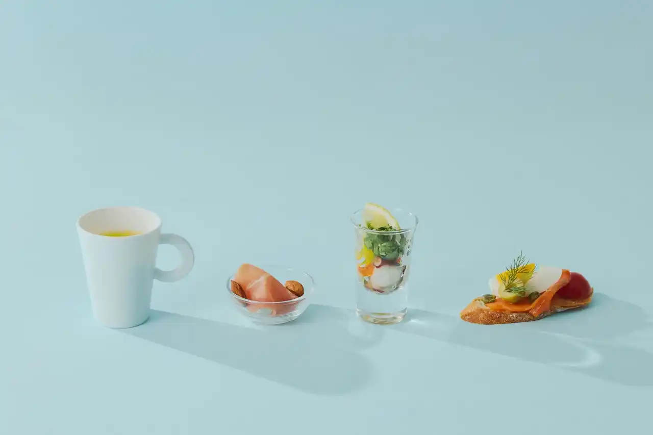 香味野菜と合わせて、柑橘の果汁でマリネした「タコのセビーチェ」、ケッパーとトマトの酸味、ライムの香りをまとわせた「スモークサーモンのカナッペ」、ほどよい塩味とコクが調和する「生ハムとアーモンド」、尾崎牛を100%使用したミニバーガーなど。変化に富んだ味わいのセイボリーを、スイーツの合間のリフレッシュとしてもお楽しみいただけます。 |