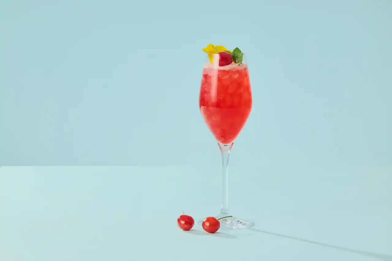 ひと口で広がる、繊細な甘みとすっきりとした余韻。ちょこんとのったさくらんぼが可愛らしい一杯 |
