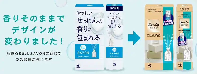 「Sawaday 香るStick SAVONホワイティッシュサボン」も同時にパッケージデザインの見直しを行いました。やさしいせっけんの香りのイメージにぴったりなナチュラルなデザインにアップデートします。(自然切替にて順次発売予定) |