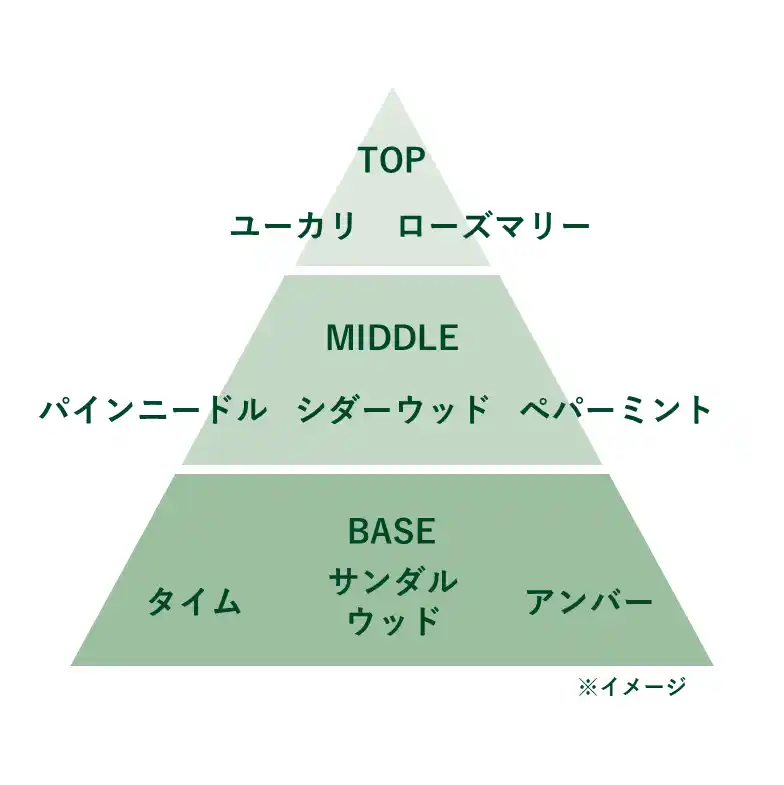 シダーウッド、パインニードルなどの豊かな木々の香りをベースに、ユーカリやミントのすっきりとしたハーブの要素を加えた親しみやすいアロマティックウッディ調の香りです。お部屋を優しくナチュラルに演出できるような、穏やかな香りを目指しました。 |