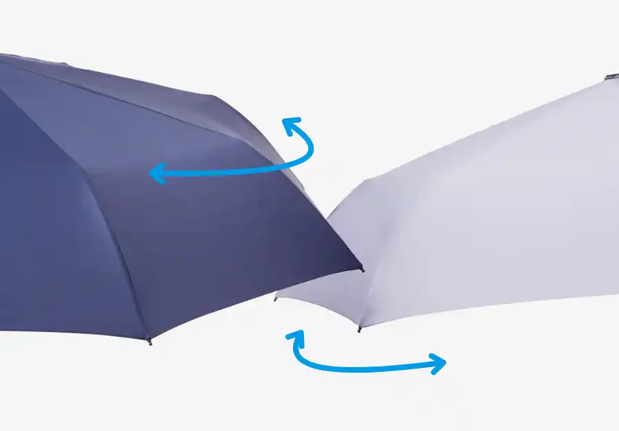 傘同士がぶつかった際の衝撃や風の衝撃を受け流し壊れにくい仕様に。傘をさすことに慣れていない子供は電柱や壁、人とすれ違う時も傘をぶつけがち。そんな時も、ぶつかった瞬間傘が周り、衝撃を受け流すので手への負担も軽減されます |