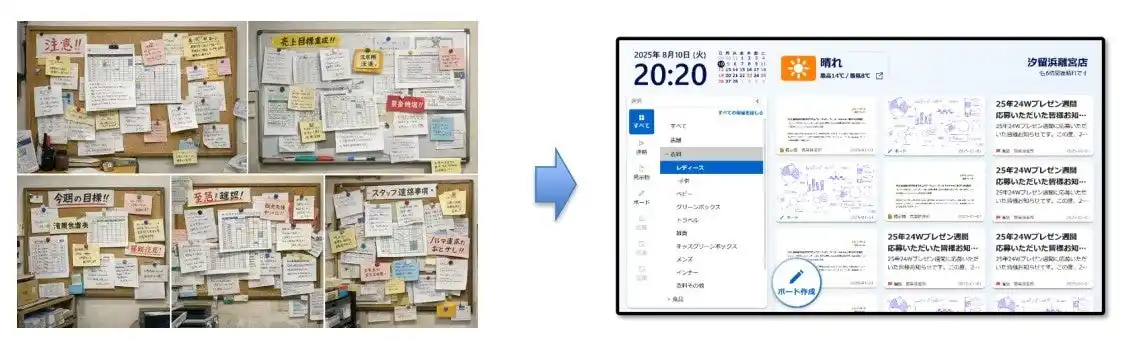 近年の小売業界では、人手不足や働き方の多様化、短期間スタッフの増加、個人情報保護意識の高まりなどを背景に、現場での情報共有や教育、セキュリティ管理において多くの課題が顕在化しています。PCやスマートフォンなどのデバイスを通じて社員への情報伝達はスピーディーに行えていますが、店舗で働くパートやアルバイトにまでデバイスを配備することは難しく、口頭や紙媒体に依存しています。それにより、連絡漏れによるオペレーションミスや教育の属人化、管理負担、セキュリティリスクが課題となっていました。 |