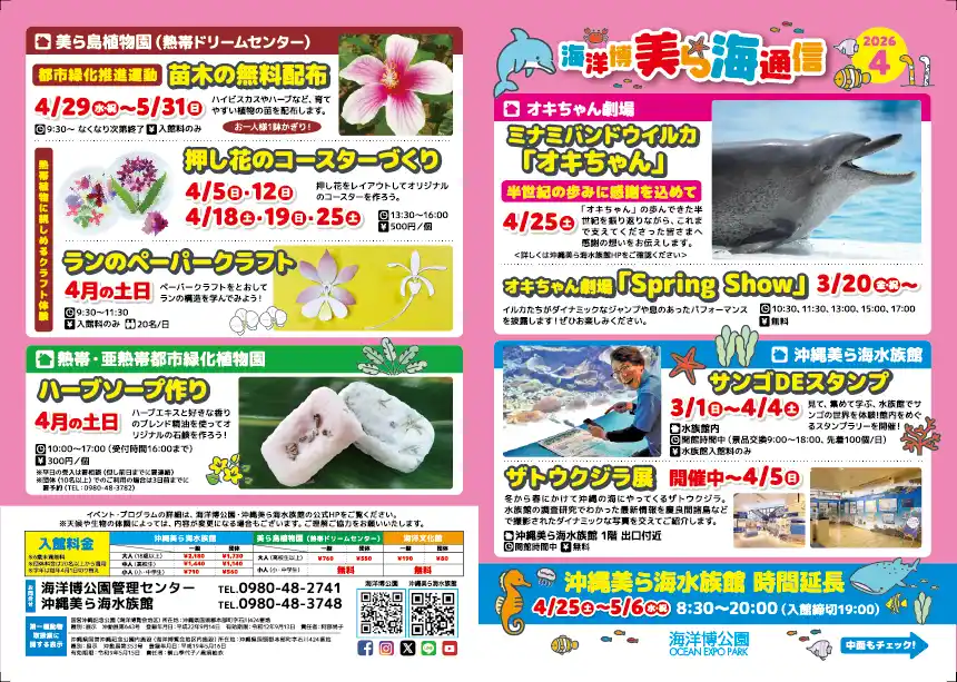 海洋博公園では、園内の最新情報やイベント情報をお届けする広報誌『美ら海通信』2026年4月号を発行いたしました。 |