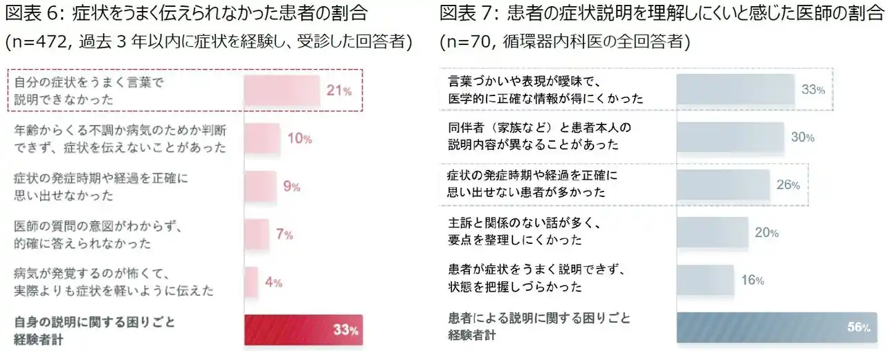 調査では診察場面におけるコミュニケーションの課題も明らかになりました。「症状を伝えることに困難を感じたことがある」と回答した割合は、患者では33%、循環器内科医では56%でした(図表6、7)。患者側では、「症状をうまく言葉で説明できなかった」(21%)が最も多く、医師側では「(患者の)言葉づかいや表現が曖昧で、医学的に正確な情報が得にくかった」(33%)が多く挙げられました。 |