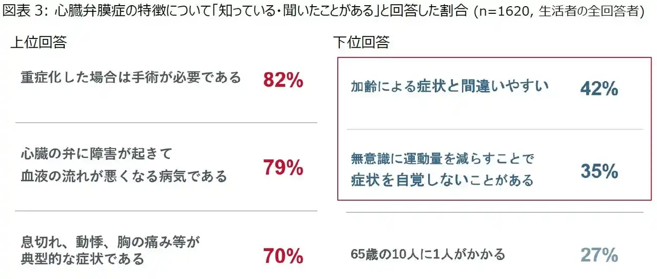 疾患名は浸透しているものの、心臓弁膜症は「自覚しにくい症状」を特徴とすることについては、十分に理解されていない実態が浮き彫りとなりました。 |