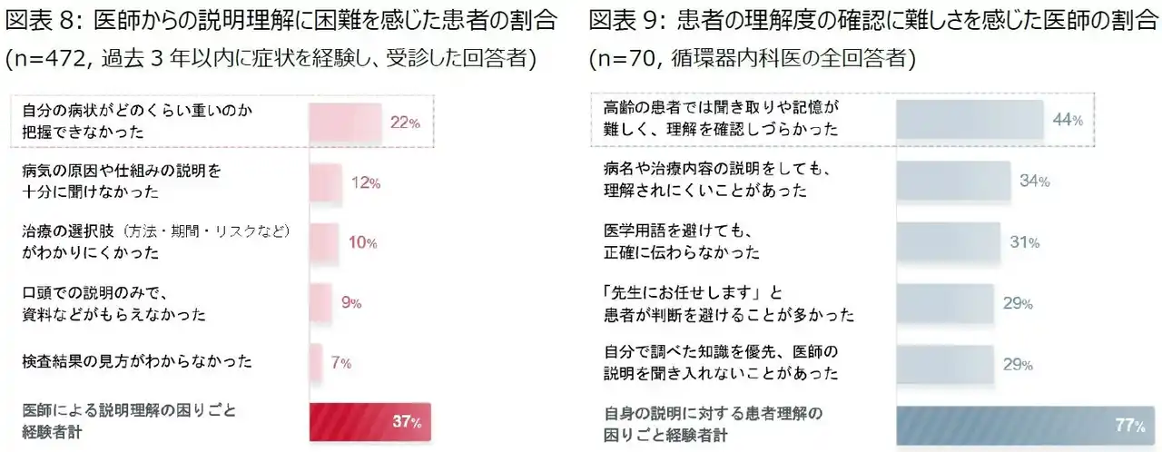 診療時の説明・理解において、患者の37%、医師の77%が困難を実感。相互理解には工夫が重要 |