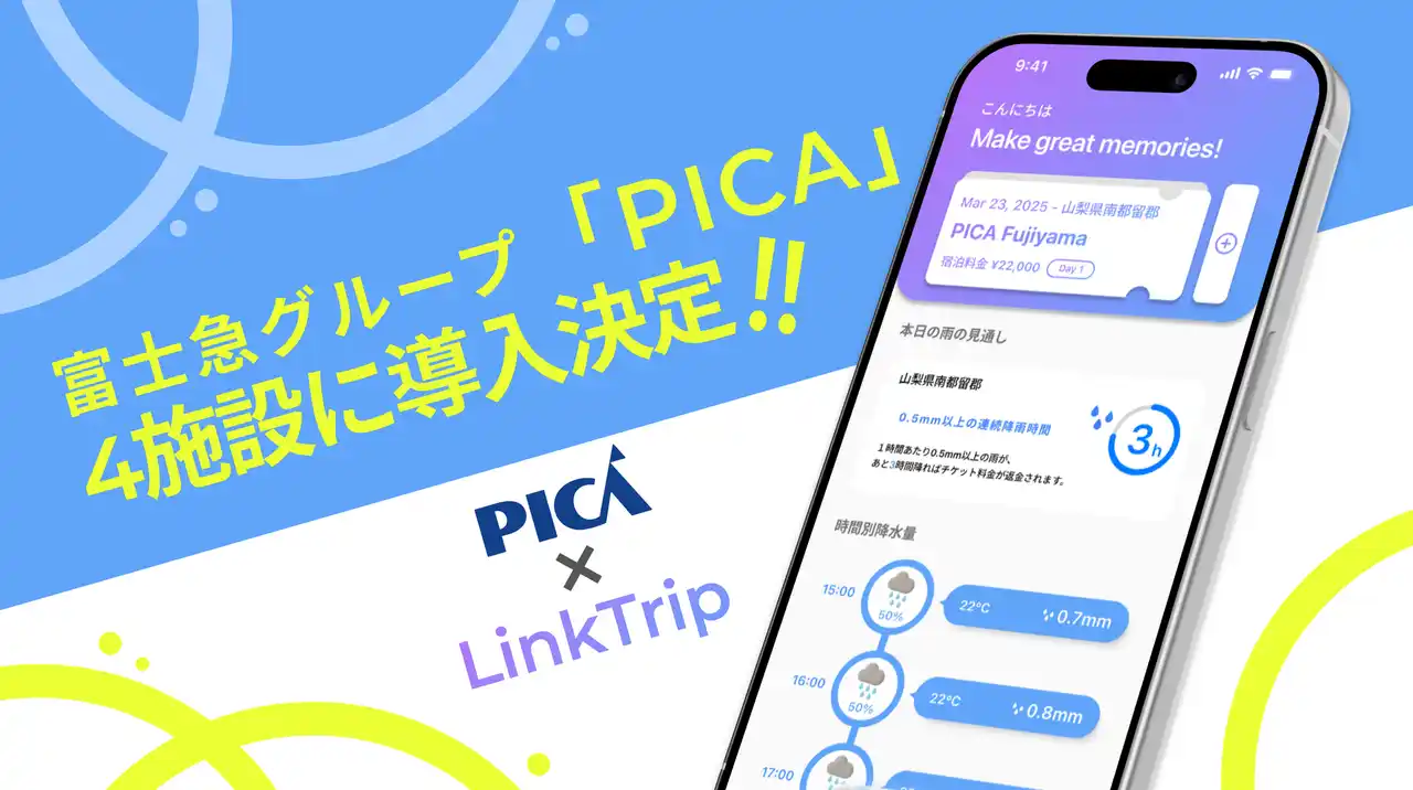 株式会社LinkTrip(本社:東京都渋谷区、社長:橋本啓佑)は、富士急行株式会社(東証プライム上場)のグループ会社である株式会社ピカ(以下「ピカ」)が運営するアウトドアリゾート「PICAリゾート」の4施設において、ジャパン少額短期保険株式会社との連携による「PICA 雨ふりHAPPY保証」を2026年4月より提供開始いたします。 |