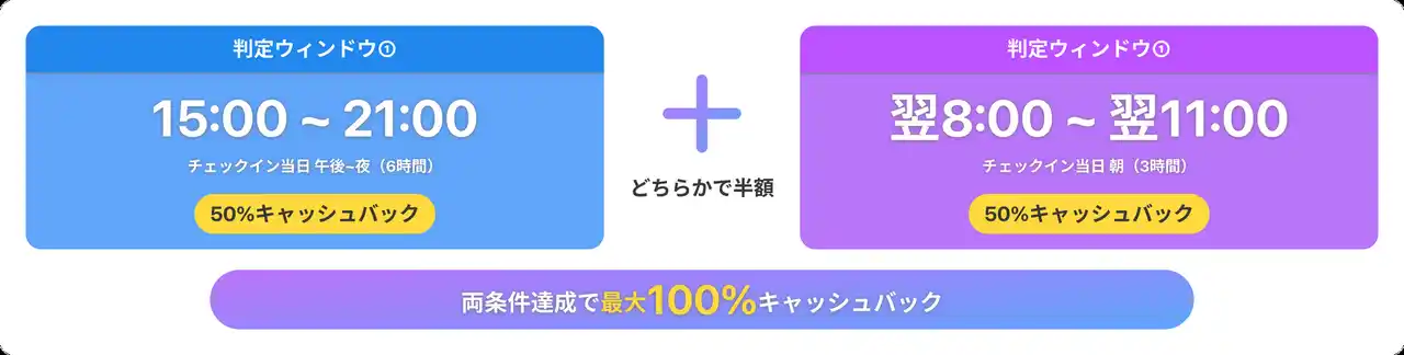 どちらか一方の条件で50%、両条件で100%のキャッシュバック。この精緻な設計により、クレームリスクを抑えながら、天候への不満を「リワードで得をした」という顧客体験に変換します。 |