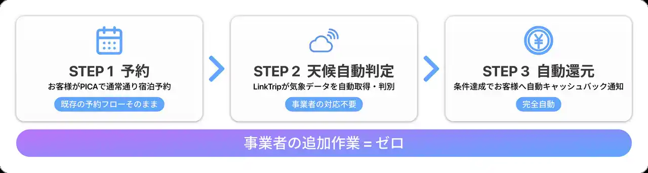 天候判定・キャッシュバック処理・精算まで一連の業務をLinkTripが担い、事業者は既存の予約フローを変えることなく導入できます。 |